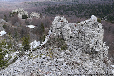 Nel giro in solitaria di oggi son ritornato - con i pretesto di un sopralluogo - sul sentiero che da Lago Duglia va a Pietra Castello, poi son salito fuori sentiero fino a Timpa Castello, portandomi sotto le selvaggi pareti est di Serra di Crispo. Da lì, ho costeggiato la cresta nord e mi sono spinto in basso attraversando senza percorso obbligato (e orientandomi con l’esperienza che ho di questi luoghi), la foresta di Cugno dell’Acero, per ritornare al punto di partenza. Venendo dalla Valle del Frido son partito però dalla radura di Acquatremola, da qui c’è una bella pista forestale, ideale da fare in mountain bike, che si collega con la strada asfaltata per Lago Duglia che proviene da Casa del Conte.